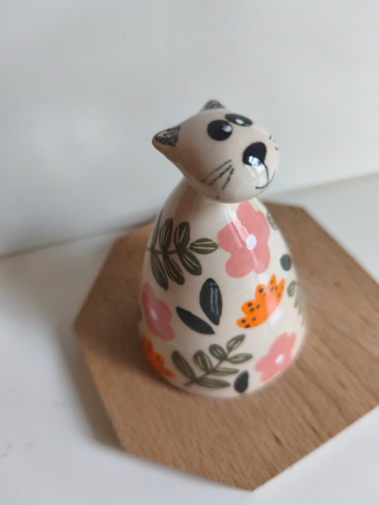 Clochette chat en faience, tournée et décorée à la main. Petite bille de terre à l'intérieur