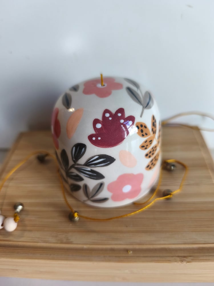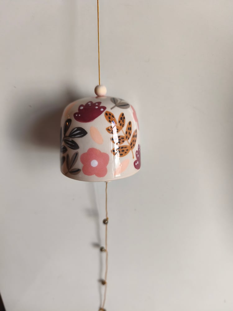 Cloche en faience, tournée et décorée à la main Fil de coton , perles bois, grelots Diamètre cloche environ 6 cm Hauteur cloche environ 6,5 cm Hauteur. Totale environ 60 cm