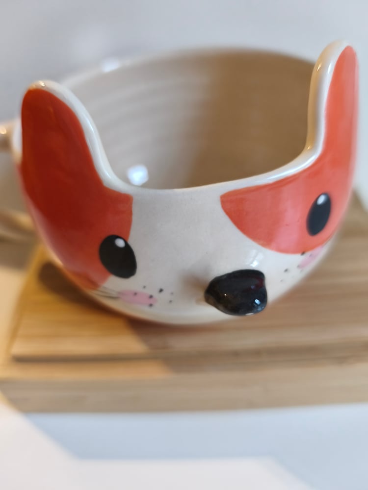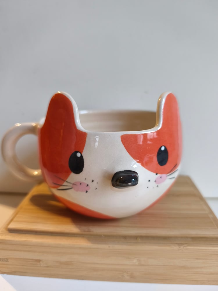 Tasse chat en faience, tournée et décorée à la main, en forme de chat