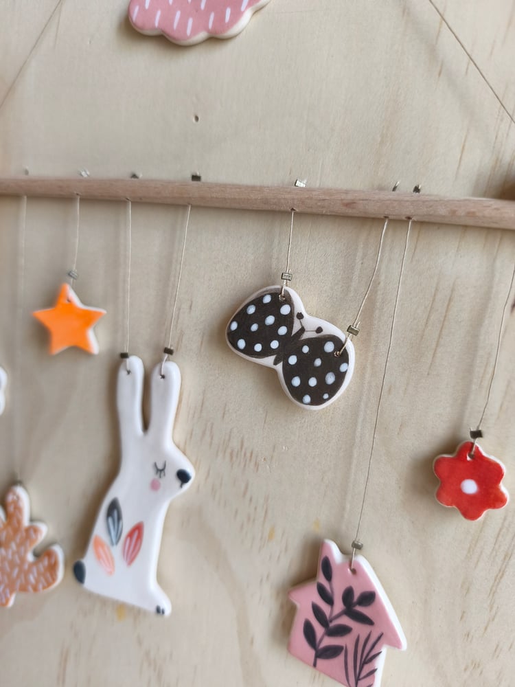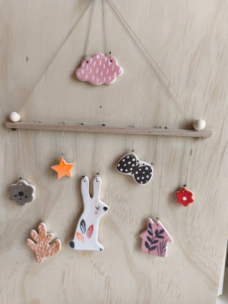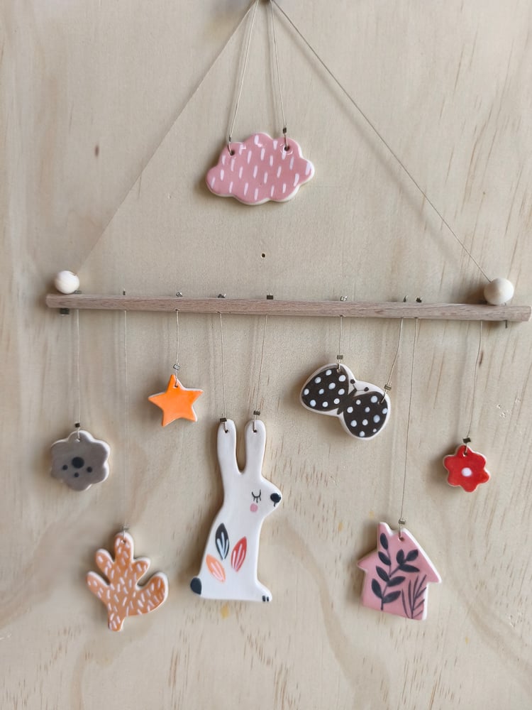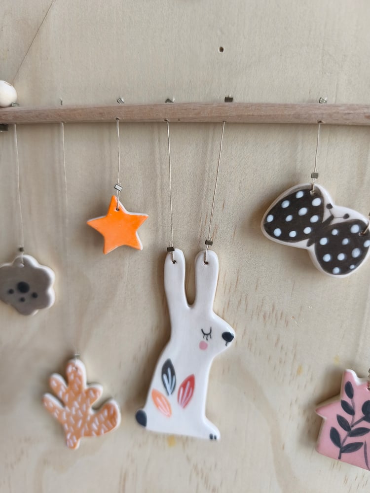 mobile lapin, éléments en céramique, bois, perles en bois, fil longueur bâton: 19 cm Hauteur totale environ 27cm
