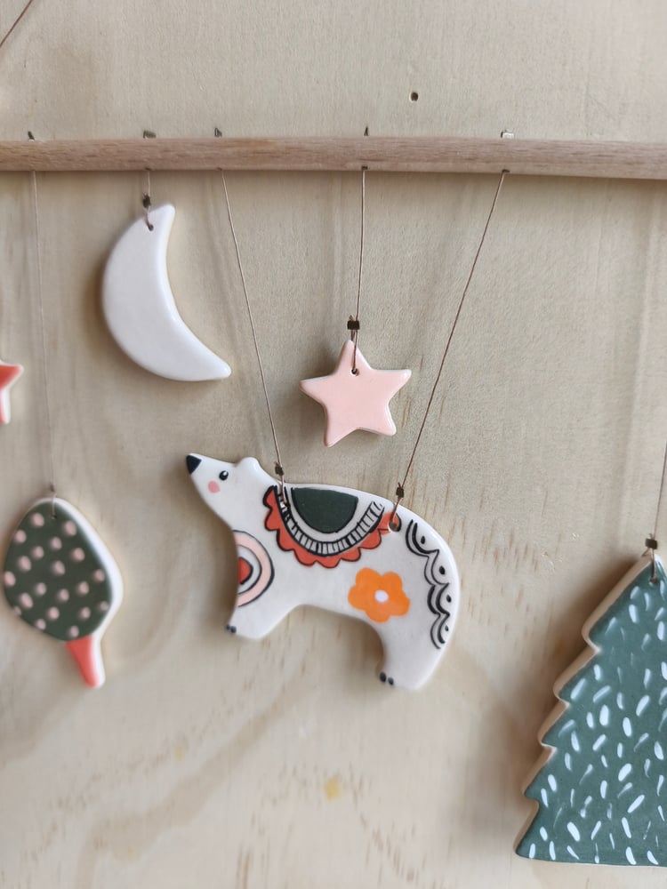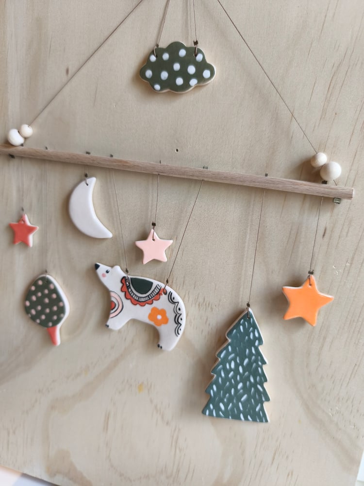 mobile petit ours, éléments en céramique, bois, perles en bois, fil longueur bâton: 21 cm Hauteur totale environ : 25cm