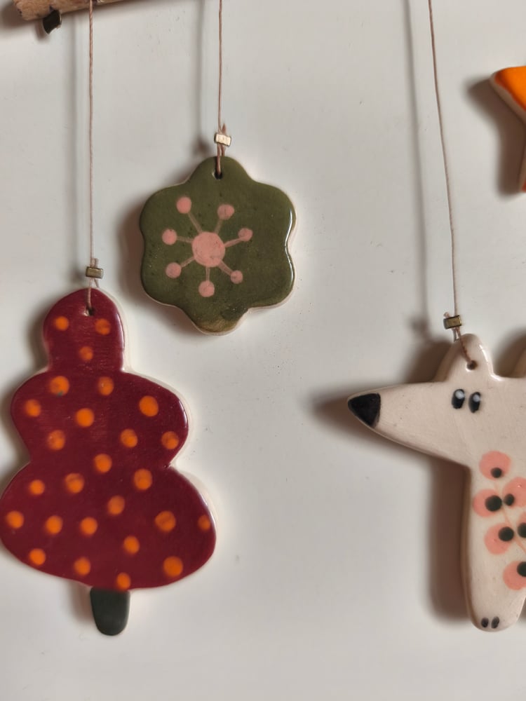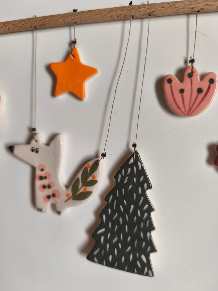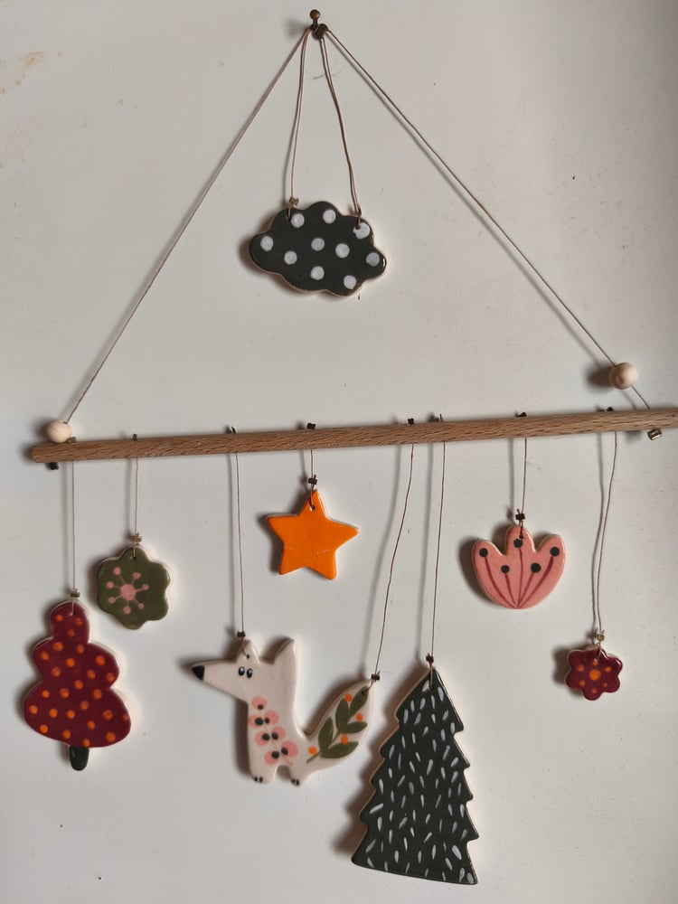 mobile petit renard, éléments en céramique, bois, perles en bois, fil longueur bâton: 20 cm Hauteur totale environ : 25cm
