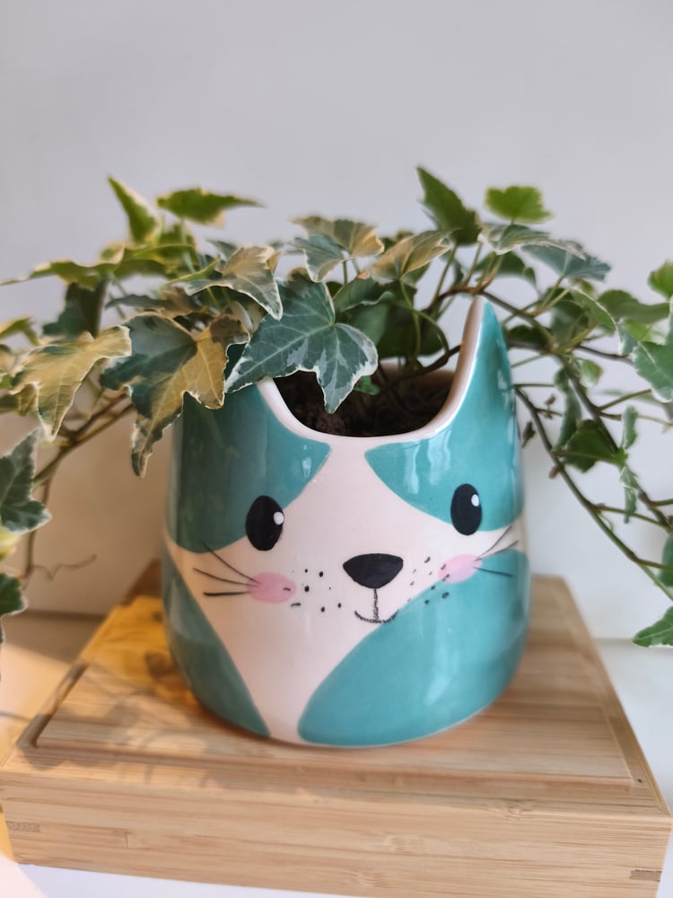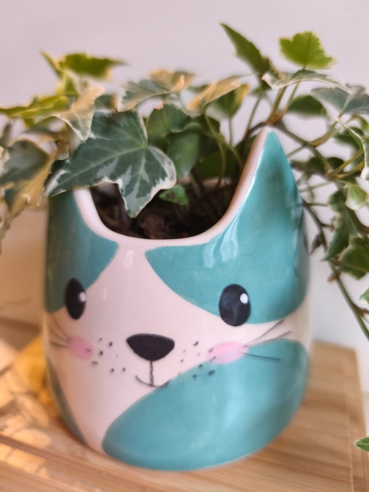 Pot chat en faience, tourné et décoré à la main, en forme de chat hauteur totale : 11 cm : diamètre : 8,5 cm