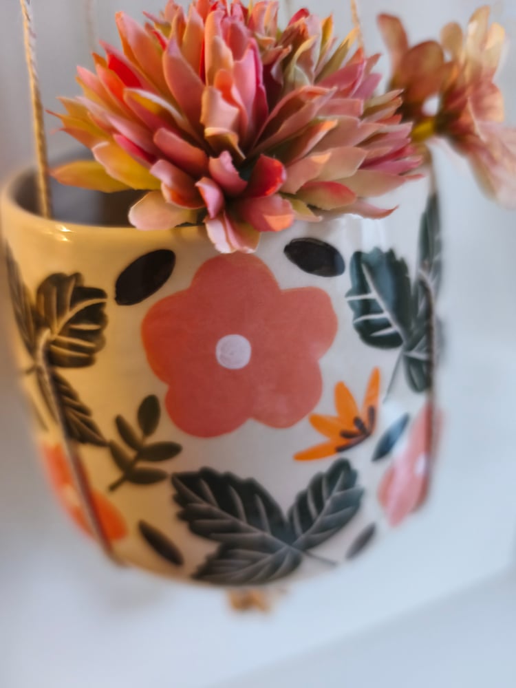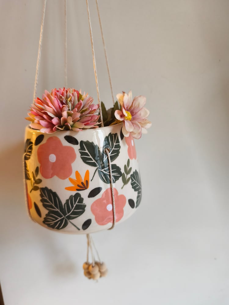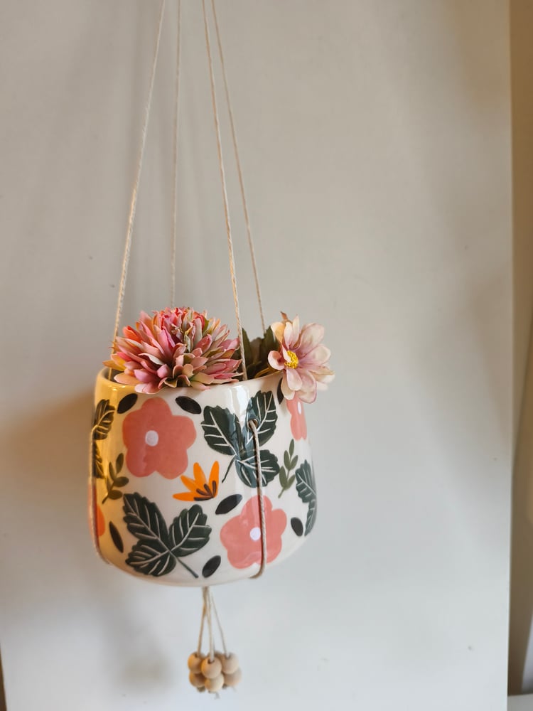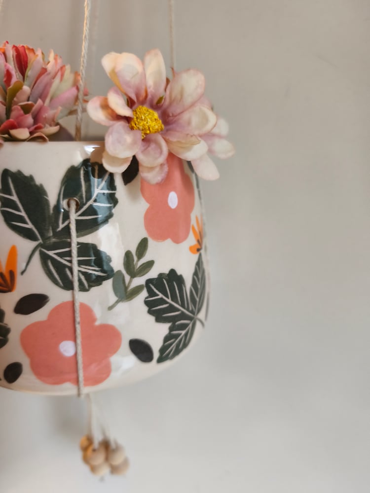 pot suspendu en faience, tourné et décoré à la main, ficelle de coton, perles en bois h: 9 cm diamètre: 10 cm