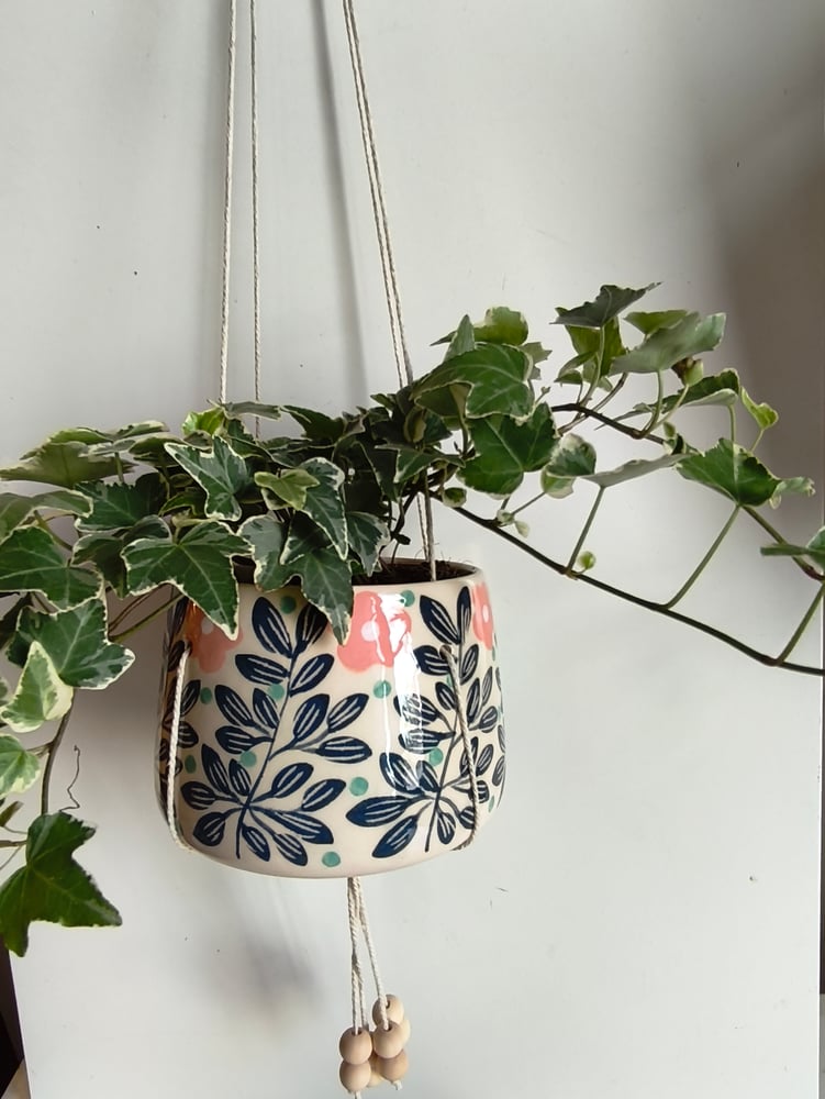 pot suspendu en faience, tourné et décoré à la main, ficelle de lin , perles en bois h: 8 cm diamètre: 9,5 cm