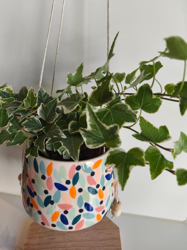 pot suspendu en faience, tourné et décoré à la main, ficelle de lin , perles en bois h: 8,5 cm diamètre: 10 cm