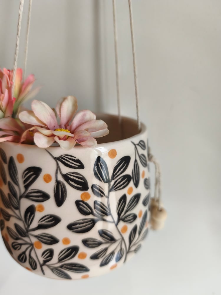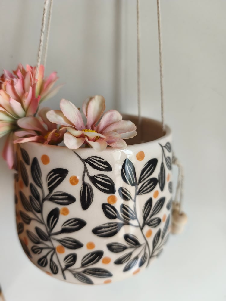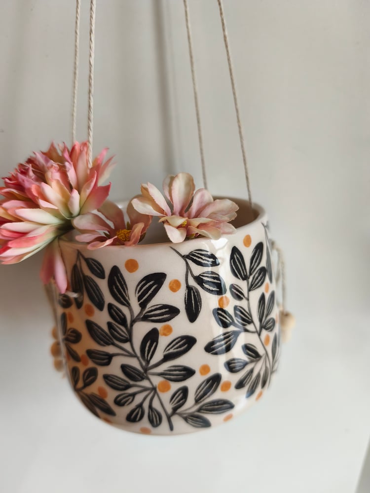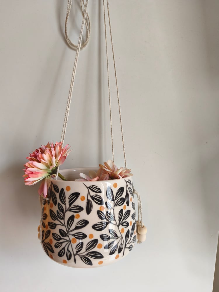 pot suspendu en faience, tourné et décoré à la main, ficelle de lin , perles en bois h: 9 cm diamètre: 9,5 cm