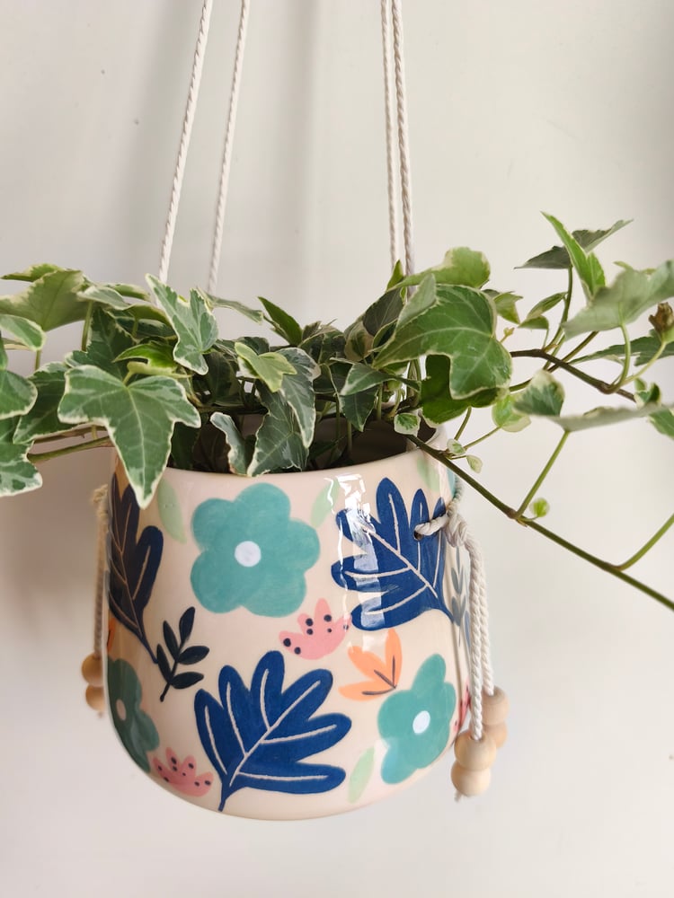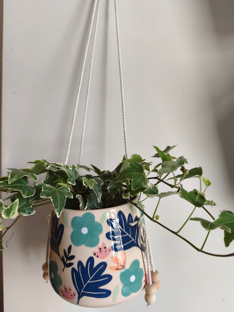 pot suspendu en faience, tourné et décoré à la main, ficelle de lin , perles en bois h: 10 cm diamètre: 9 cm