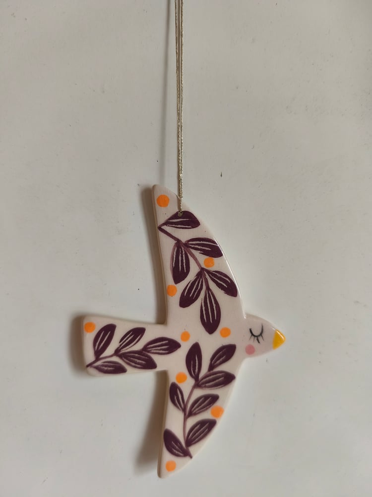 Oiseau à suspendre ,éléments en céramique, fil doré pour l'accrocher