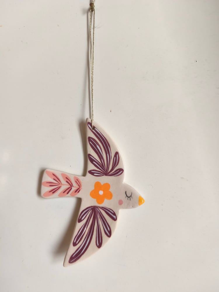 Oiseau à suspendre ,éléments en céramique, fil doré pour l'accrocher