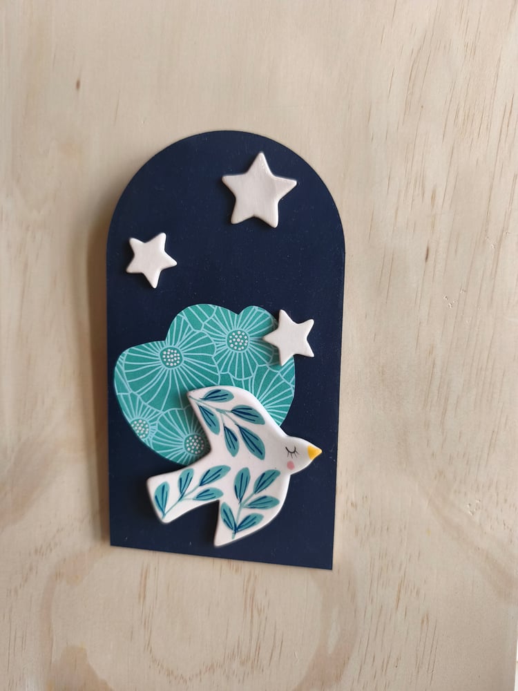 Décoration cadre oiseau, étoiles en céramique sur un support bois cartonné Attache au dos Hauteur : 18 cm Largeur : 10 cm