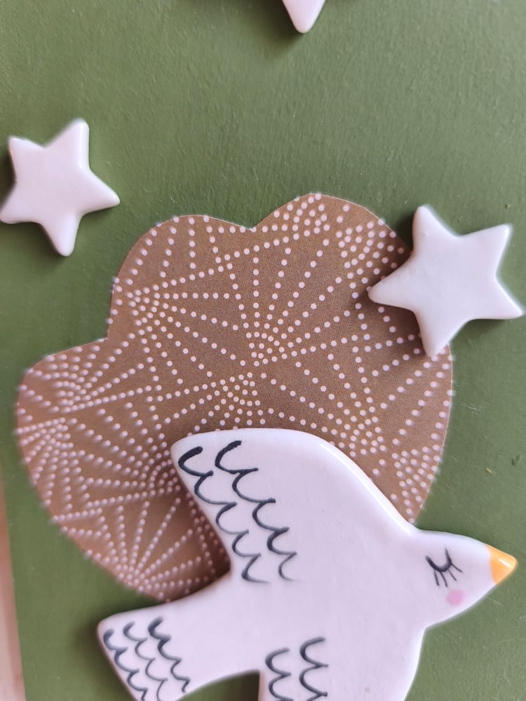 Décoration cadre oiseau, étoiles en céramique sur un support bois cartonné