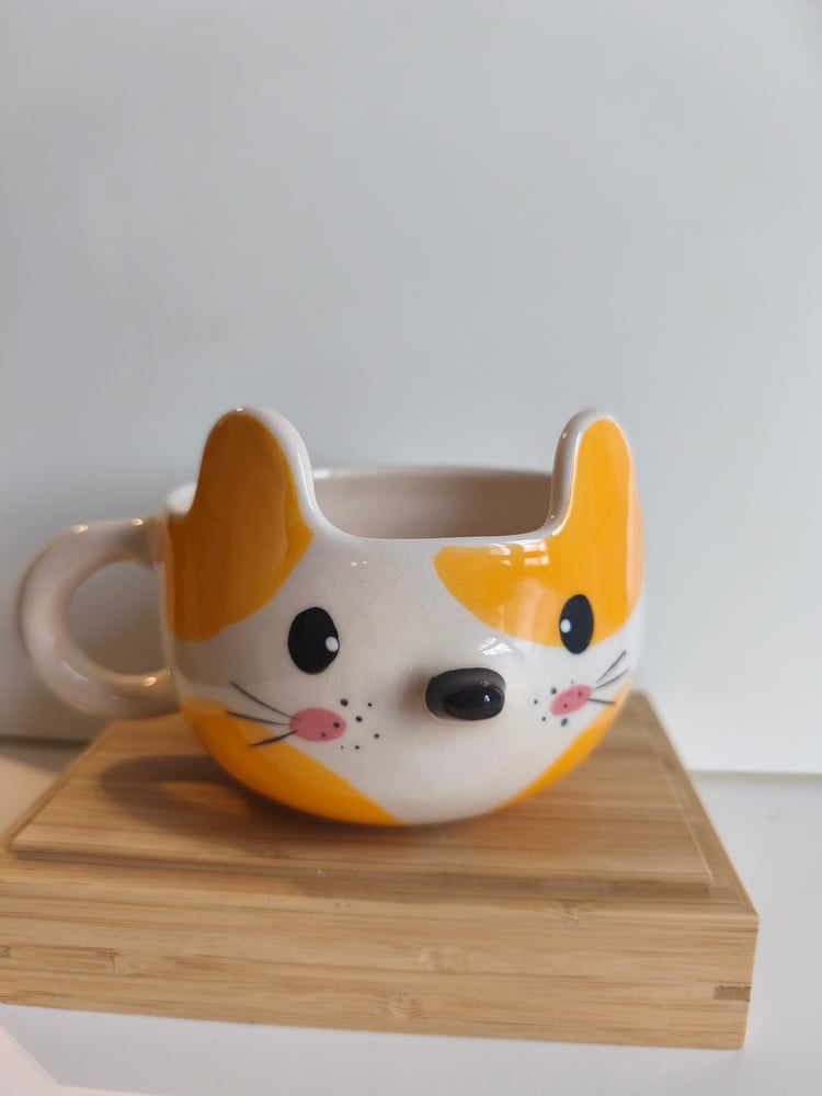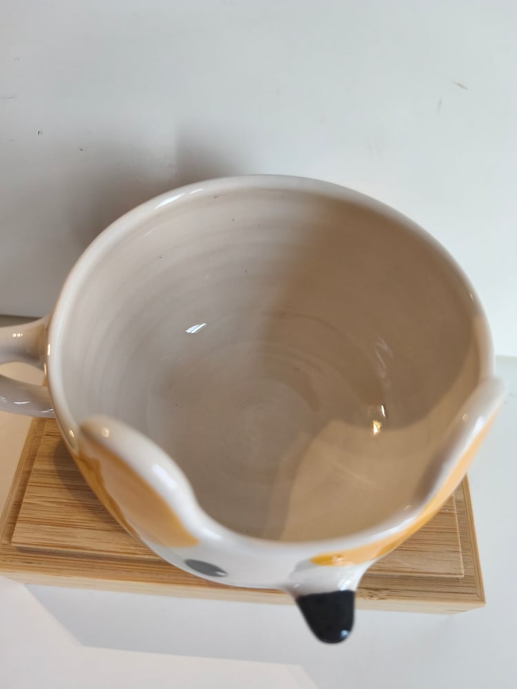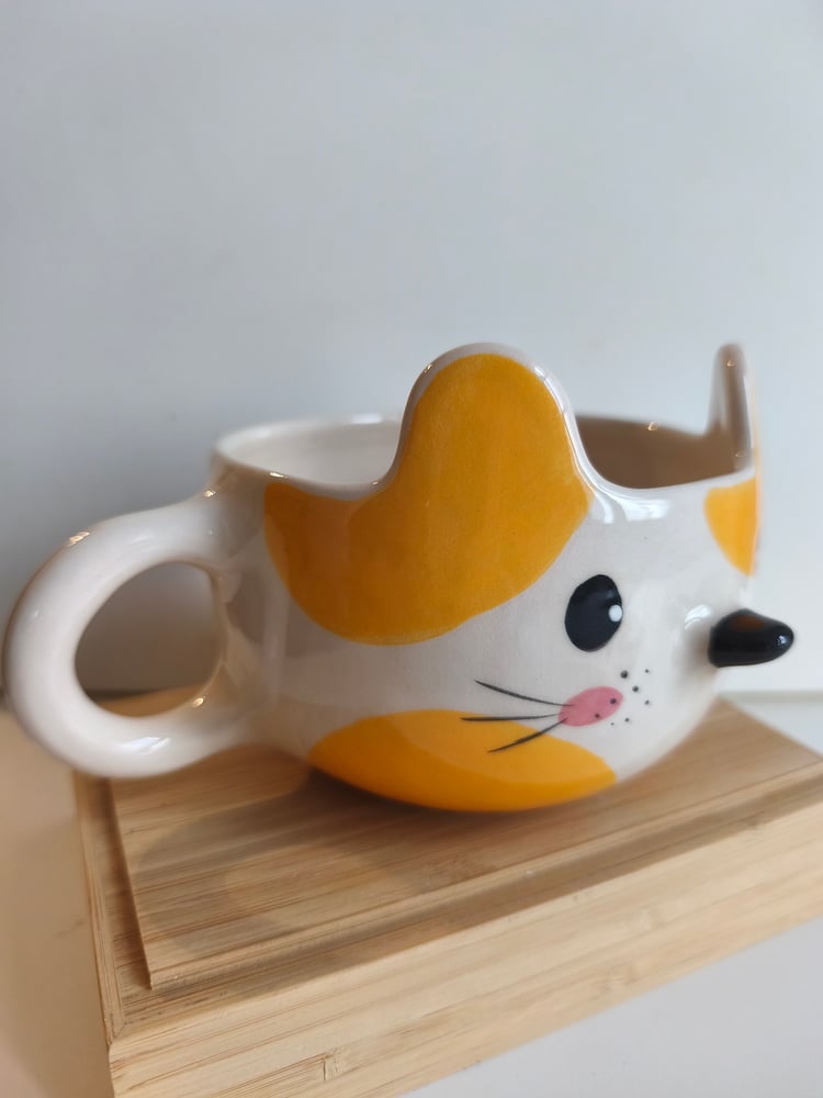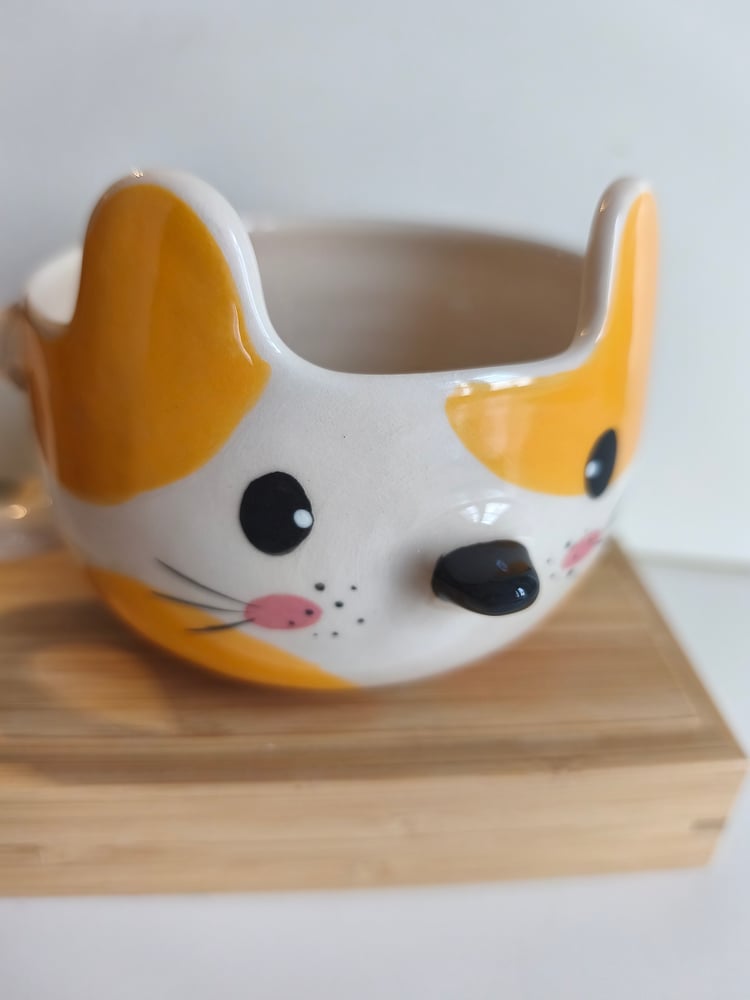 Tasse chat en faience, tournée et décorée à la main, en forme de chat