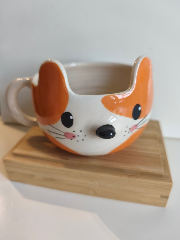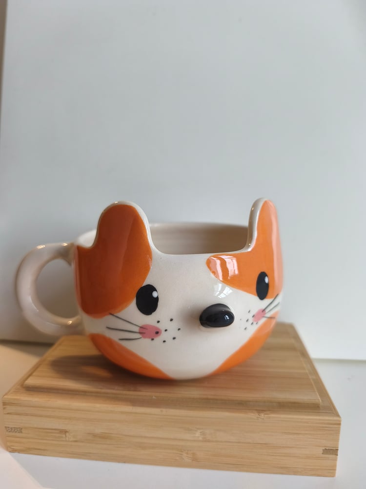 Tasse chat en faience, tournée et décorée à la main, en forme de chat