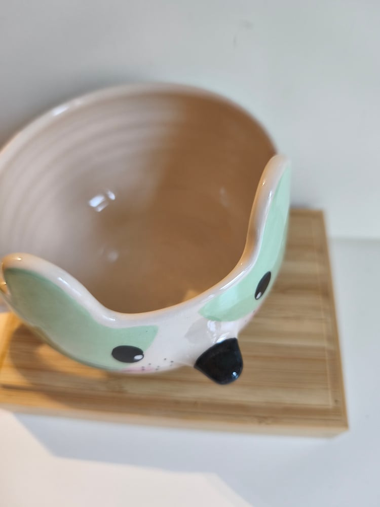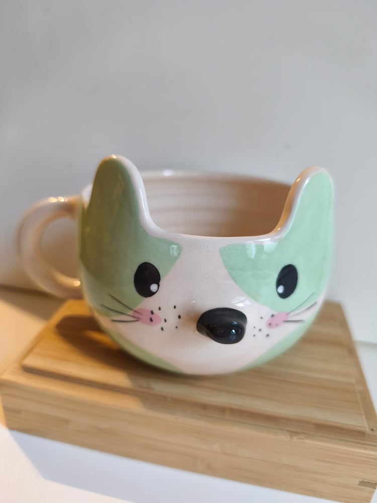 Tasse chat en faience, tournée et décorée à la main, en forme de chat