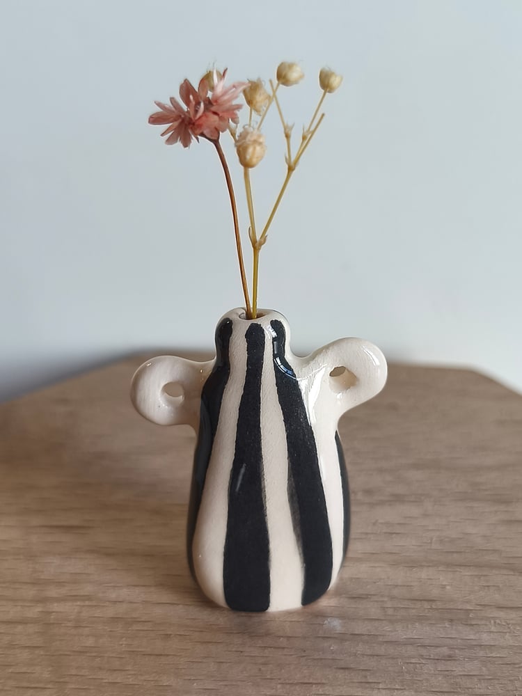 Vase miniature en faience, modelé et décoré à la main. Trou percé sur le dessus pour y insérer une petite branche de fleurs.