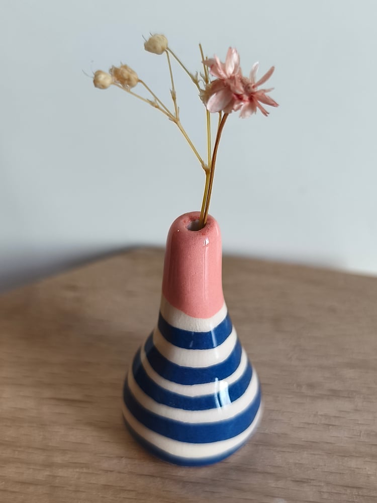 Vase miniature en faience, modelé et décoré à la main. Trou percé sur le dessus pour y insérer une petite branche de fleurs.
