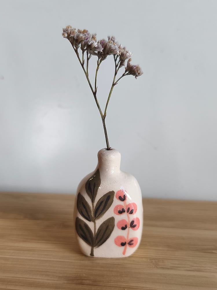 Vase miniature en faience, modelé et décoré à la main. Trou percé sur le dessus pour y insérer une petite branche de fleurs.