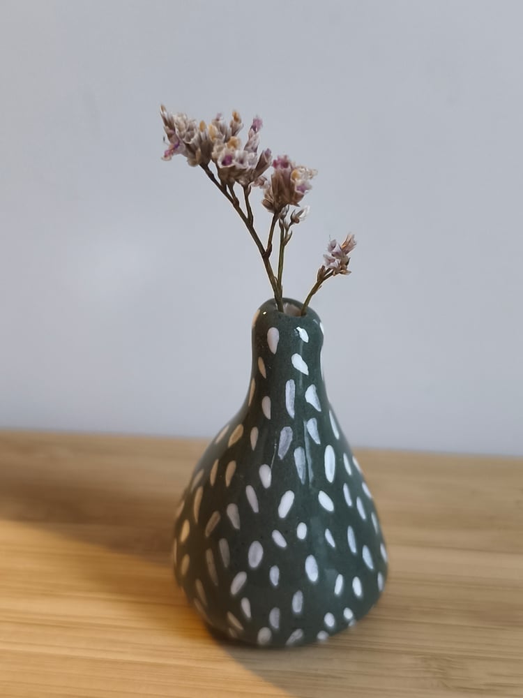 Vase miniature en faience, modelé et décoré à la main. Trou percé sur le dessus pour y insérer une petite branche de fleurs.