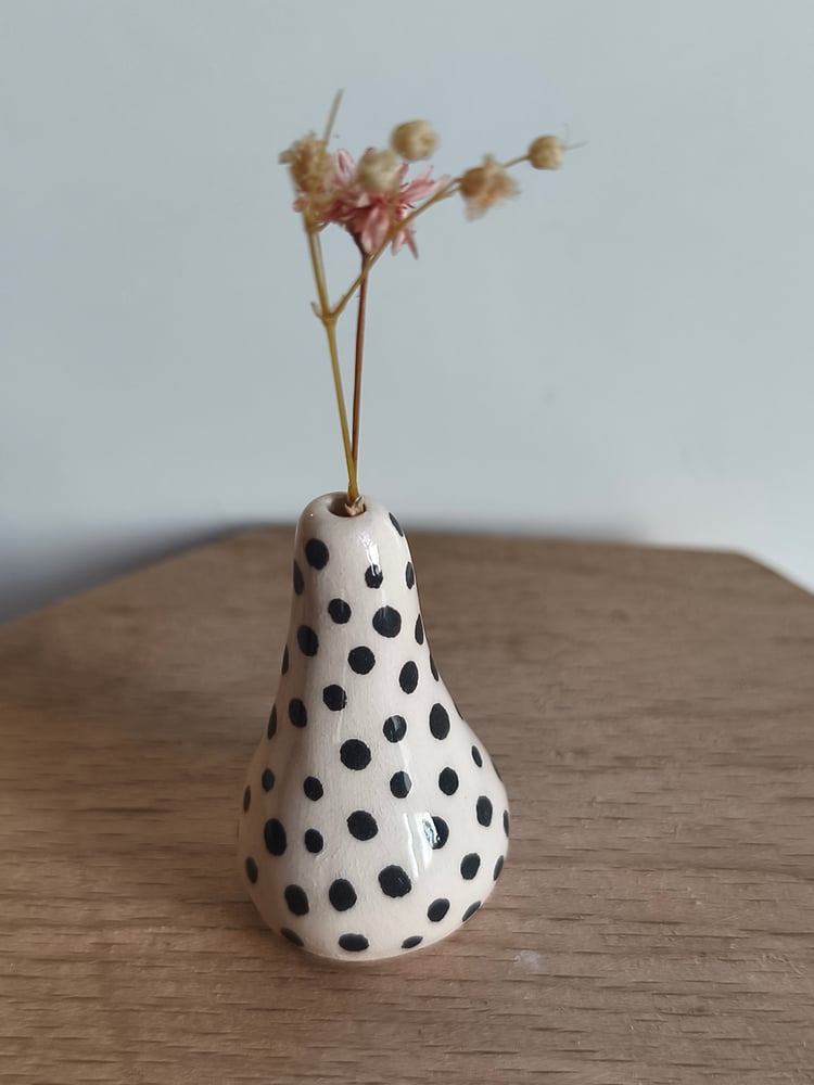 Vase miniature en faience, modelé et décoré à la main. Trou percé sur le dessus pour y insérer une petite branche de fleurs.