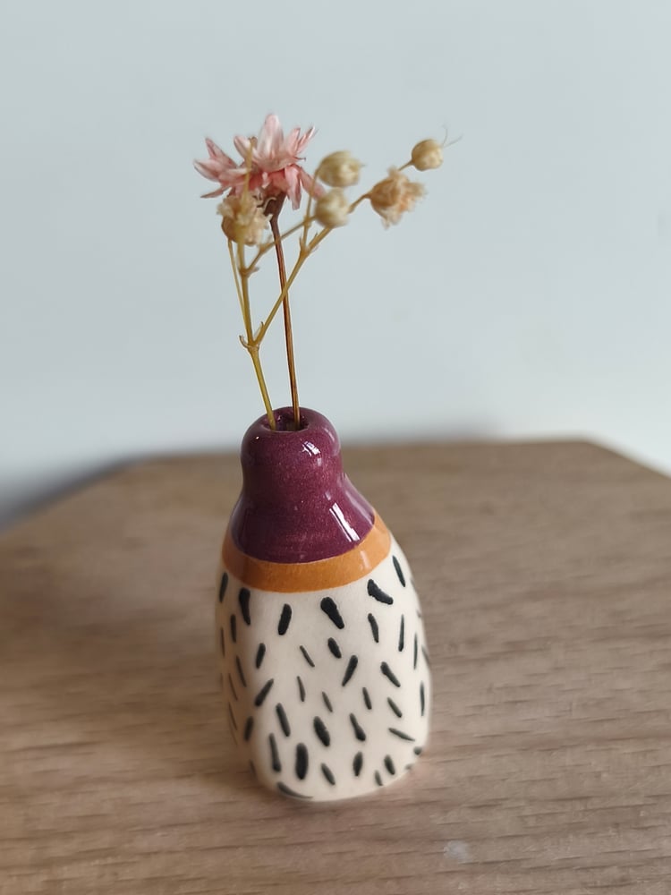 Vase miniature en faience, modelé et décoré à la main. Trou percé sur le dessus pour y insérer une petite branche de fleurs. les minis vases mesurent environ de 3 cm à 5cm de hauteur