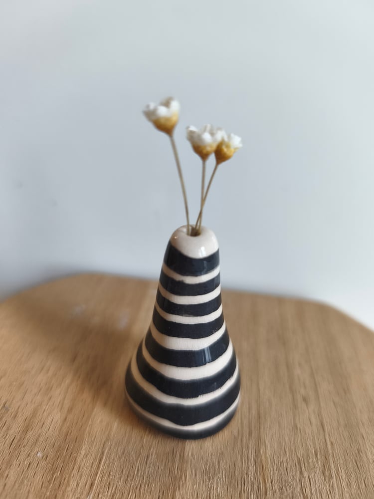 Vase miniature en faience, modelé et décoré à la main. Trou percé sur le dessus pour y insérer une petite branche de fleurs.