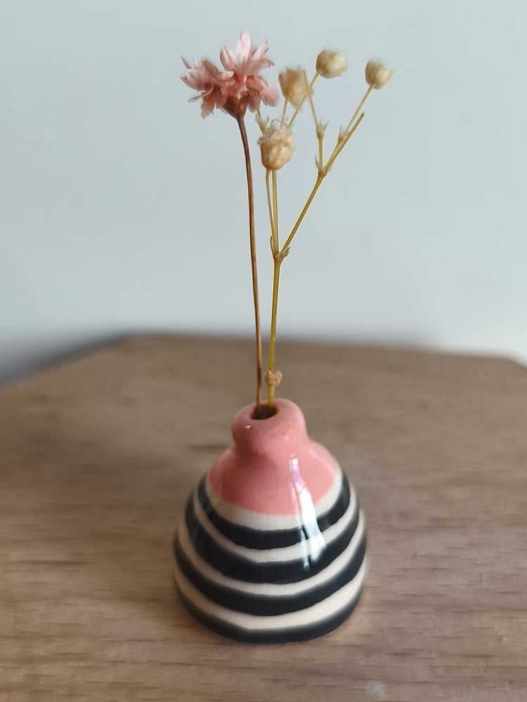 Vase miniature en faience, modelé et décoré à la main. Trou percé sur le dessus pour y insérer une petite branche de fleurs. les minis vases mesurent environ de 3 cm à 5cm de hauteur