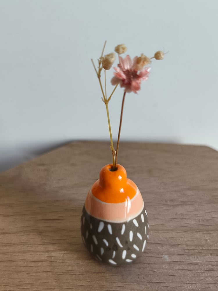 Vase miniature en faience, modelé et décoré à la main. Trou percé sur le dessus pour y insérer une petite branche de fleurs. les minis vases mesurent environ de 3 cm à 5cm de hauteur