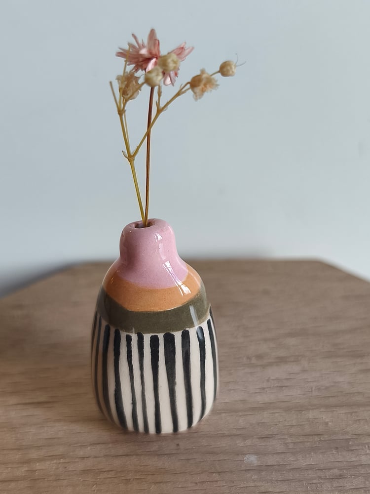 Vase miniature en faience, modelé et décoré à la main. Trou percé sur le dessus pour y insérer une petite branche de fleurs.