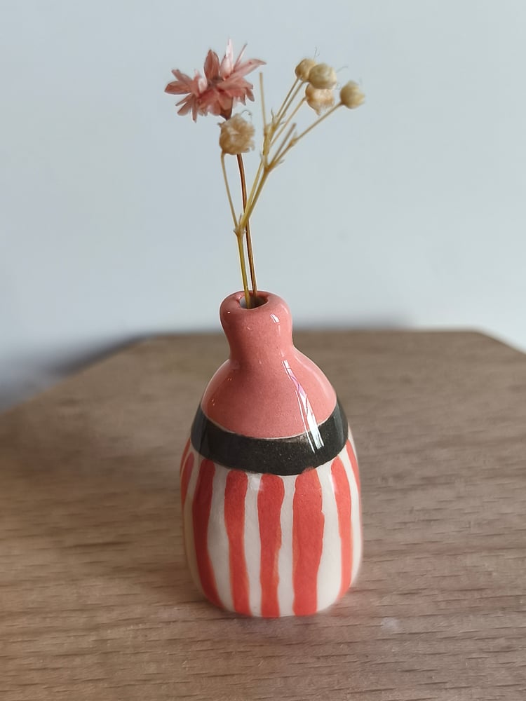 Vase miniature en faience, modelé et décoré à la main. Trou percé sur le dessus pour y insérer une petite branche de fleurs. les minis vases mesurent environ de 3 cm à 5cm de hauteur