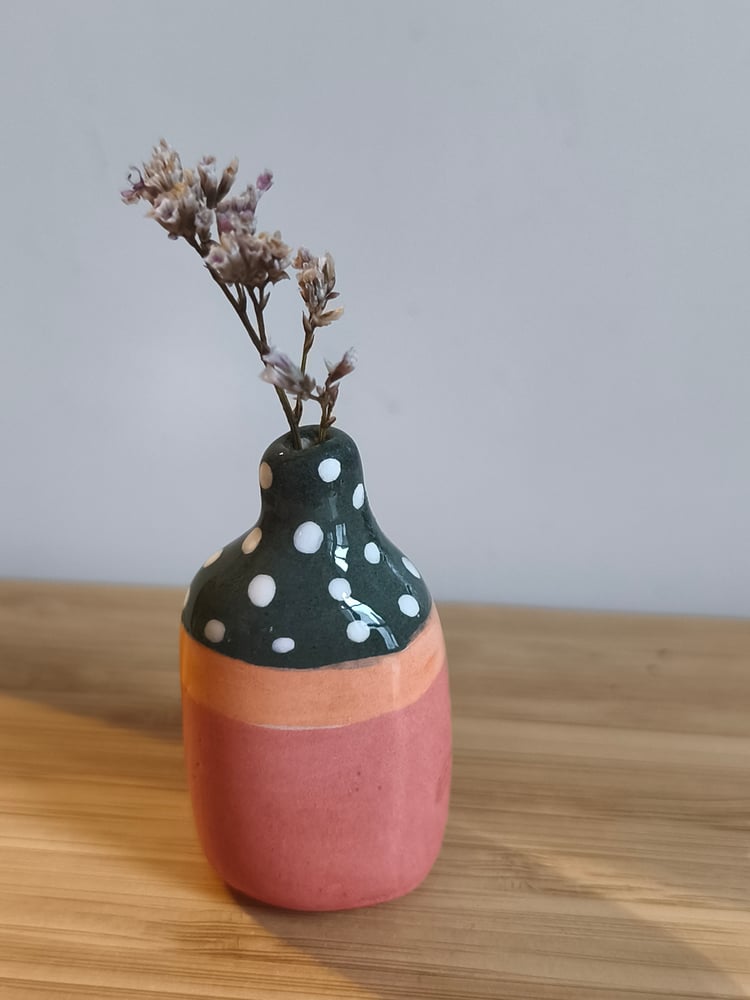 Vase miniature en faience, modelé et décoré à la main. Trou percé sur le dessus pour y insérer une petite branche de fleurs. les minis vases mesurent environ de 3 cm à 5cm de hauteur
