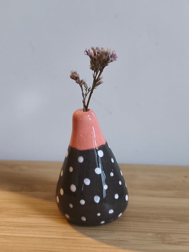 Vase miniature en faience, modelé et décoré à la main. Trou percé sur le dessus pour y insérer une petite branche de fleurs.